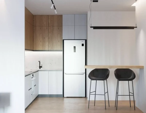 Акцентами стали – дерево светлого оттенка и синий цвет, именно они придали цвету и натуральности пространства.