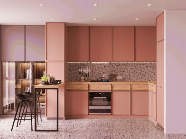 Яркий акцент проекта – цветовая палитра и пастельные элементы в кухне.