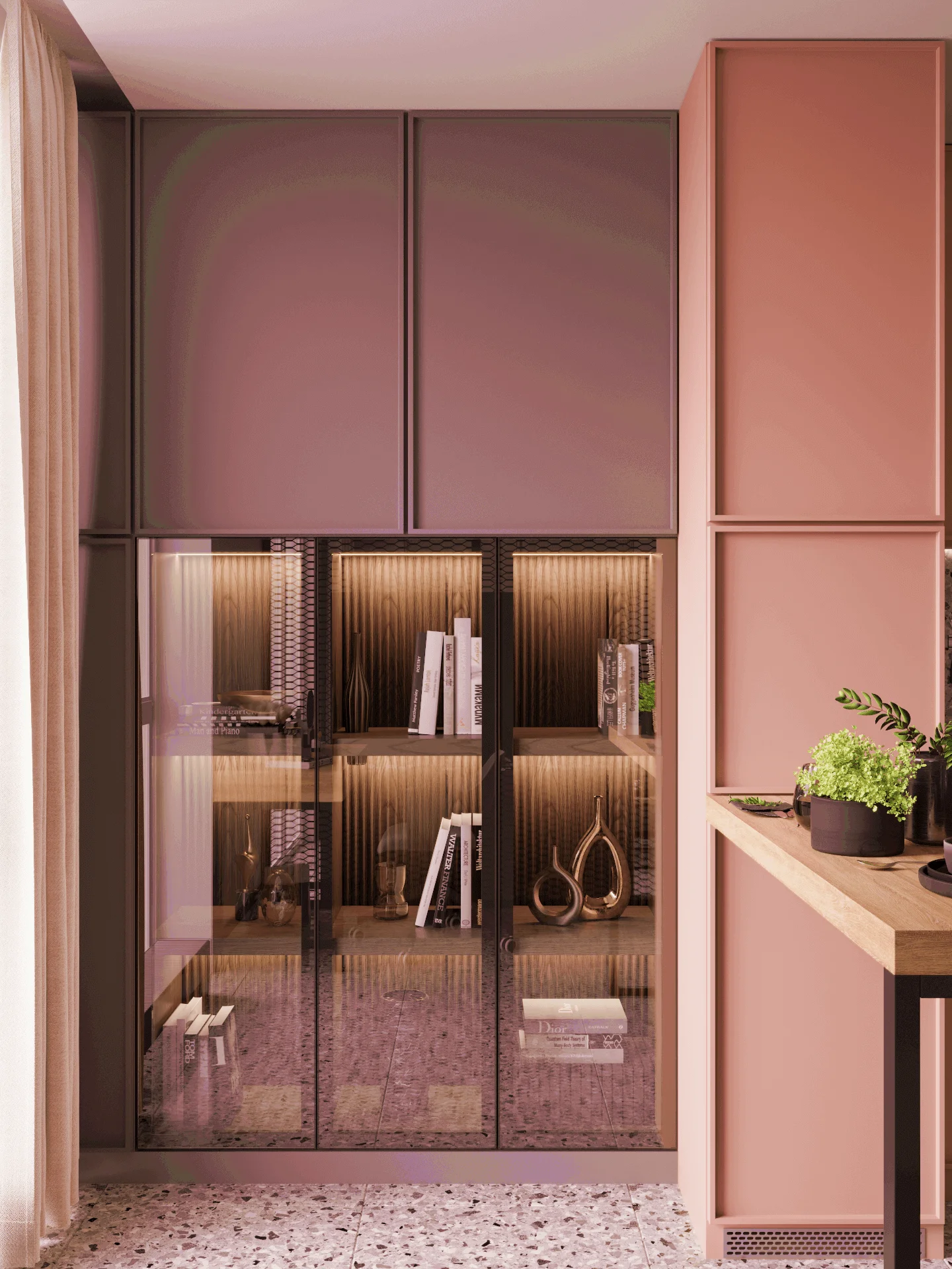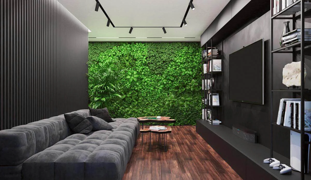 Стены обработаны мебельными панелями и декоративной штукатуркой, что придает разнообразие фактур и натуральность в пространстве